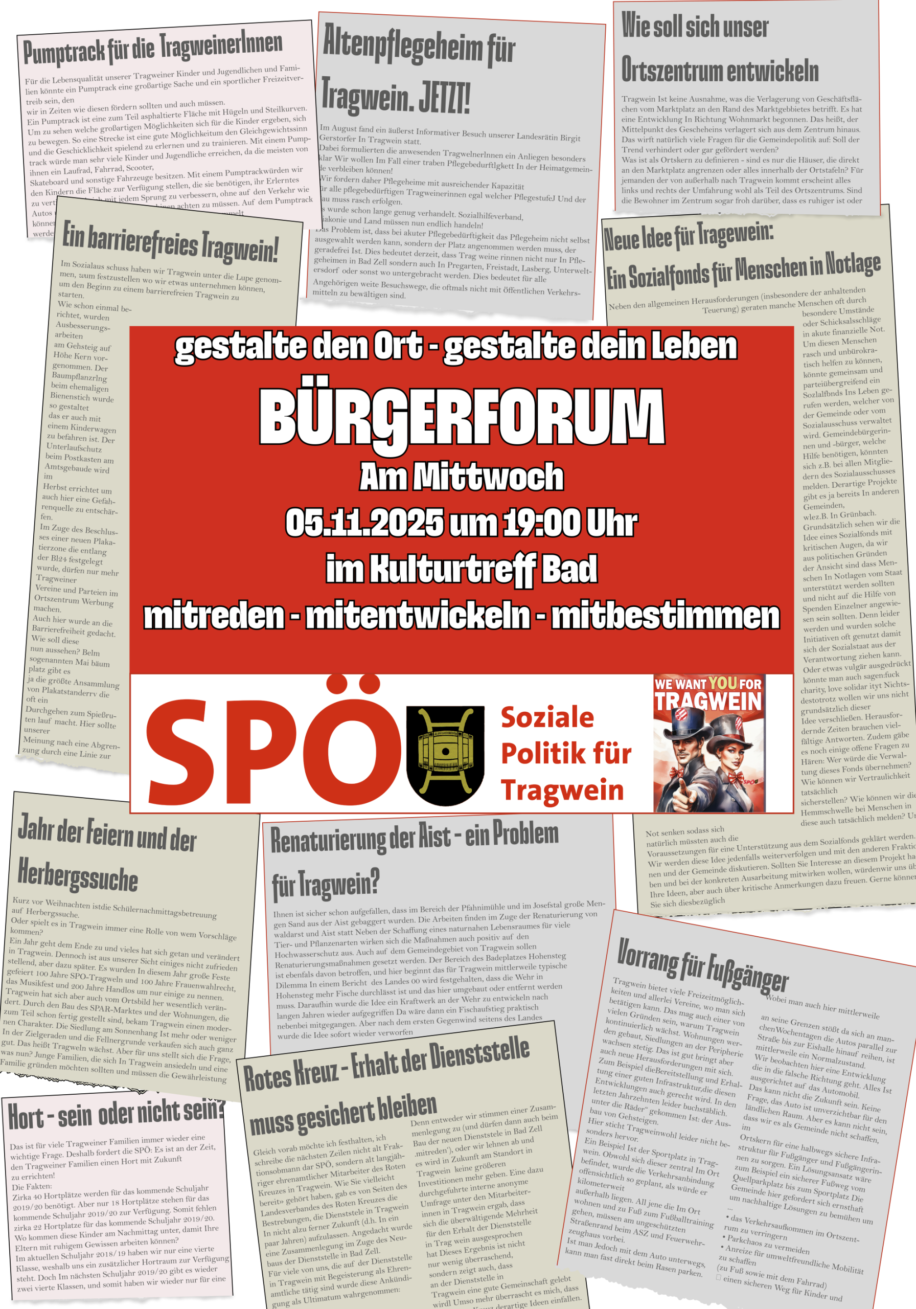 Einladung zum Bürgerforum in Tragwein! Du möchtest dich über die aktuelle Situation in unserer Gemeinde informieren? Du hast neue Ideen, die du einbringen möchtest? Oder du hast Wünsche und Anliegen an die Gemeindepolitik? Dann komm vorbei zu unserem Bürgerforum und gestalte die Zukunft von Tragwein aktiv mit!